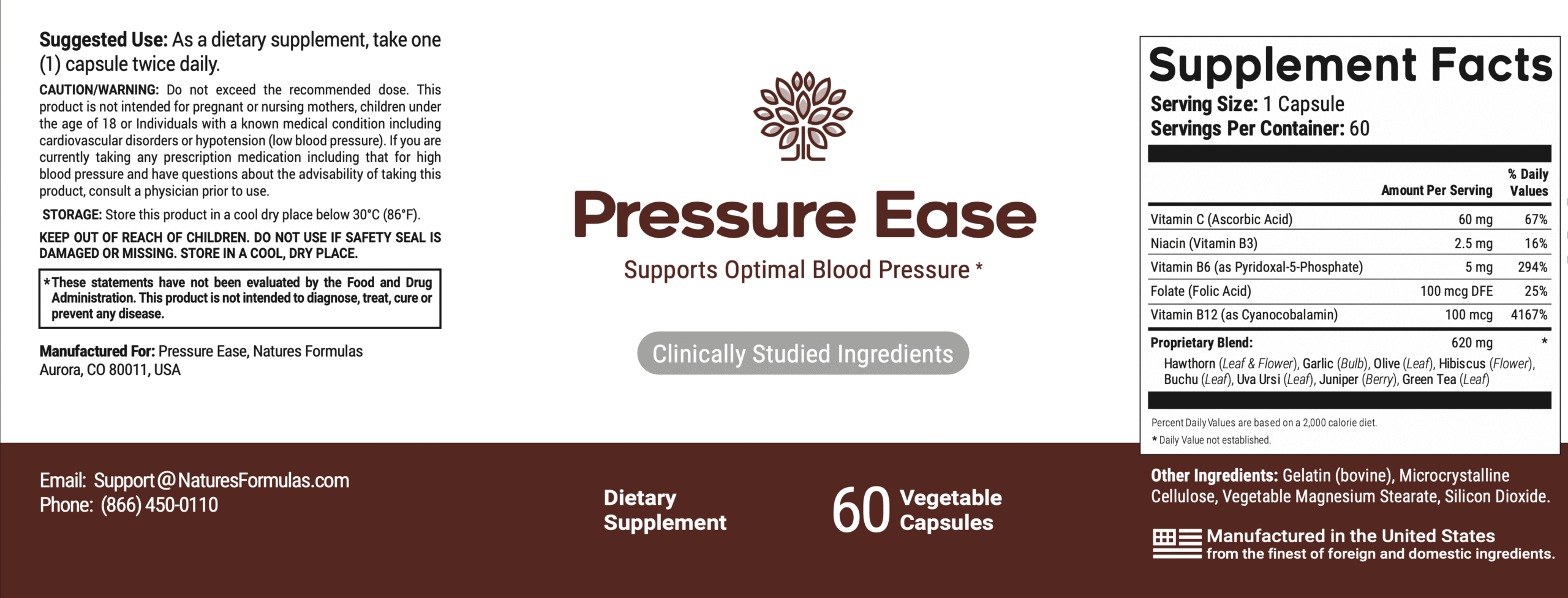 We stand behind the quality and effectiveness of Pressure Ease. If you’re not completely satisfied with your results, please contact our customer support team at Support@NaturesFormulas.com or call (866) 450-0110. We’re committed to providing the highest quality products and the best customer experience in the industry. Our team is here to answer any questions you may have and ensure you have a positive experience with our products.